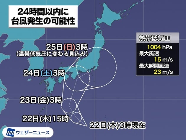 9月22日(木)3時に日本の南で発達中の熱帯低気圧が24時間以内に台風に発達する見込みとの情報を気象庁が発表しました。