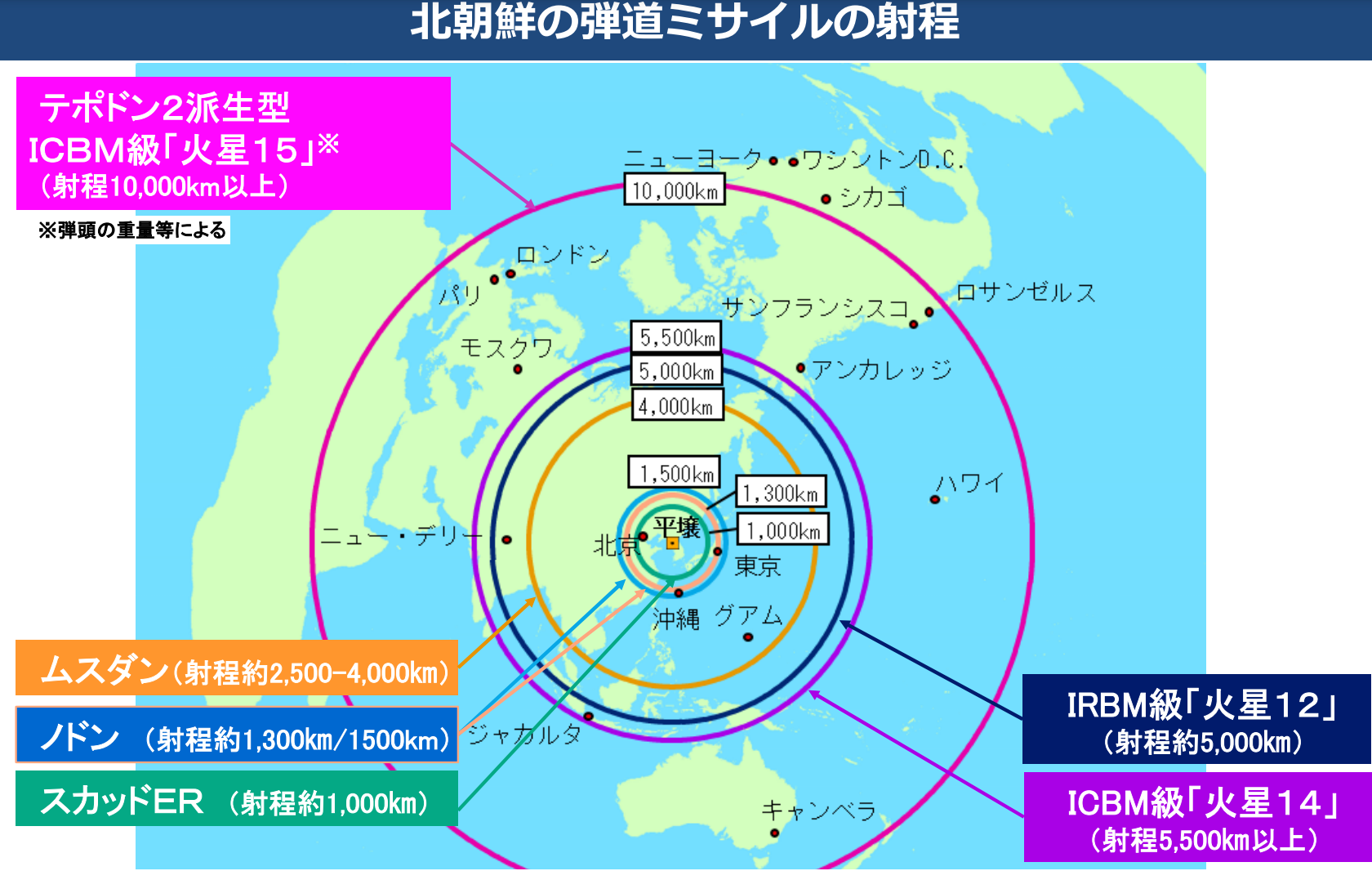 2018年版防衛白書<巻頭特集1>より北朝鮮からのミサイルの場合、平壌を起点とすると、東京まではおよそ1300キロ。アメリカ領で島内にアメリカ海軍・空軍の基地や施設が多数あるグアムまではおよそ3400キロ、アメリカ東部の首都ワシントンまではおよそ1万1000キロとなる。