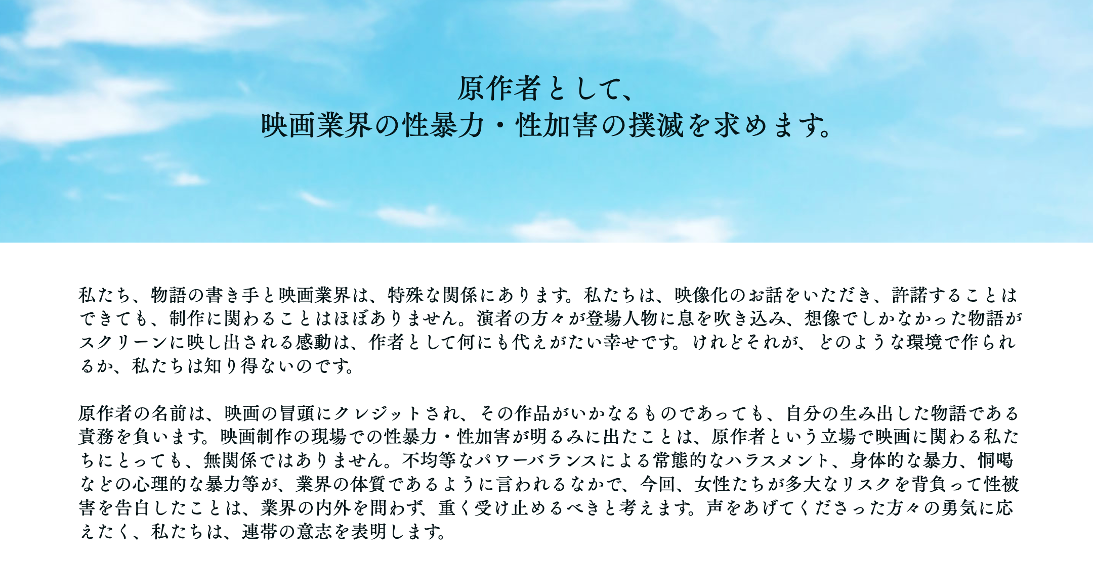 この声明内容は、「作家協会にとどまるべきではありません」とし、「この声明の精神が映像業界全体の常識になるよう、全力を尽くしていきます」と宣言した。