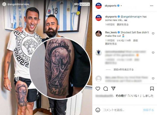 ディ・マリアの右太腿には大きなW杯トロフィーが刻まれ、W杯共に戦ったDFニコラス・オタメンディやMFパプ・ゴメスが反応。