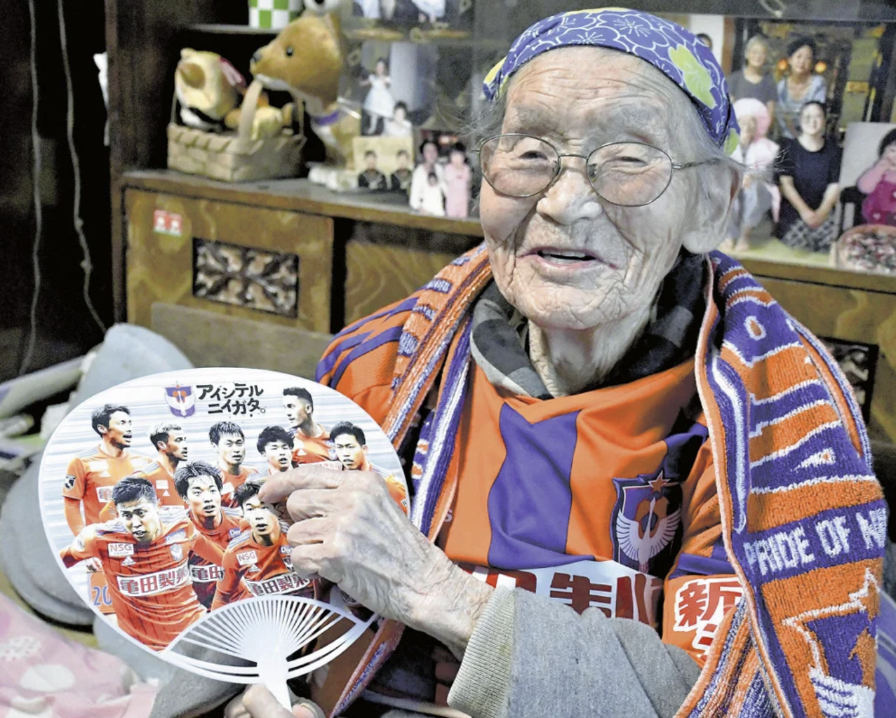 サッカーのルールは知らないが、「球(ボール)が入ると抱き合って喜ぶのがいいね」と川崎さん。ゴールを「網」、GKを「門番」と例える。チーム名もアルビと言わずに、ユニホームの企業ロゴにある米菓大手の亀田製菓(新潟市江南区)にちなんで、「柿の種」と呼ぶ。アルビが試合に負けると、「負けてばかりだと会社が潰れる」と心配になるという。