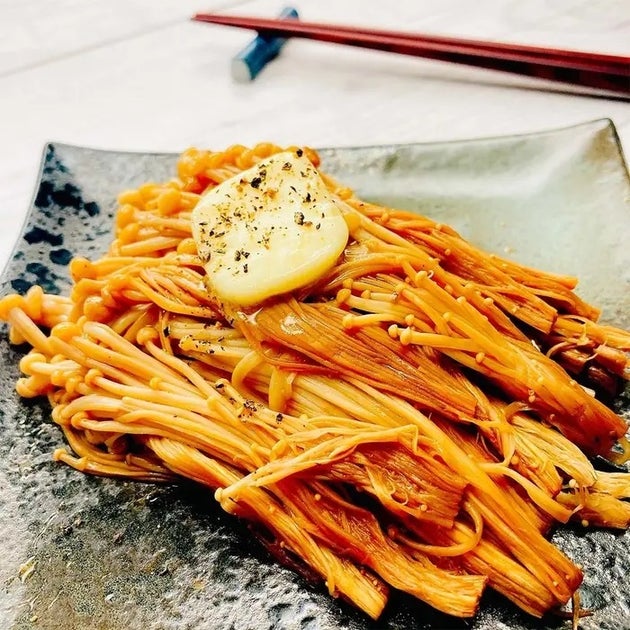 レンジで無限おつまみレシピ!えのきとしょうゆをレンジで加熱して、バターをのせるだけ!濃厚なバターしょうゆがえのきに染み込み、一度食べたら、お箸が止まりません!
