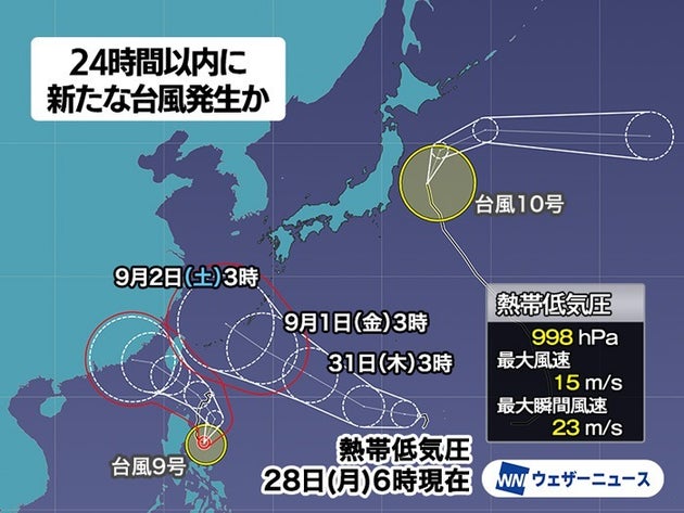 8月28日(月)6時現在、マリアナ諸島で発達中の熱帯低気圧について、気象庁は「24時間以内に台風に発達する見込み」と発表しています。次に台風が発生すると台風11号と呼ばれることになります。
