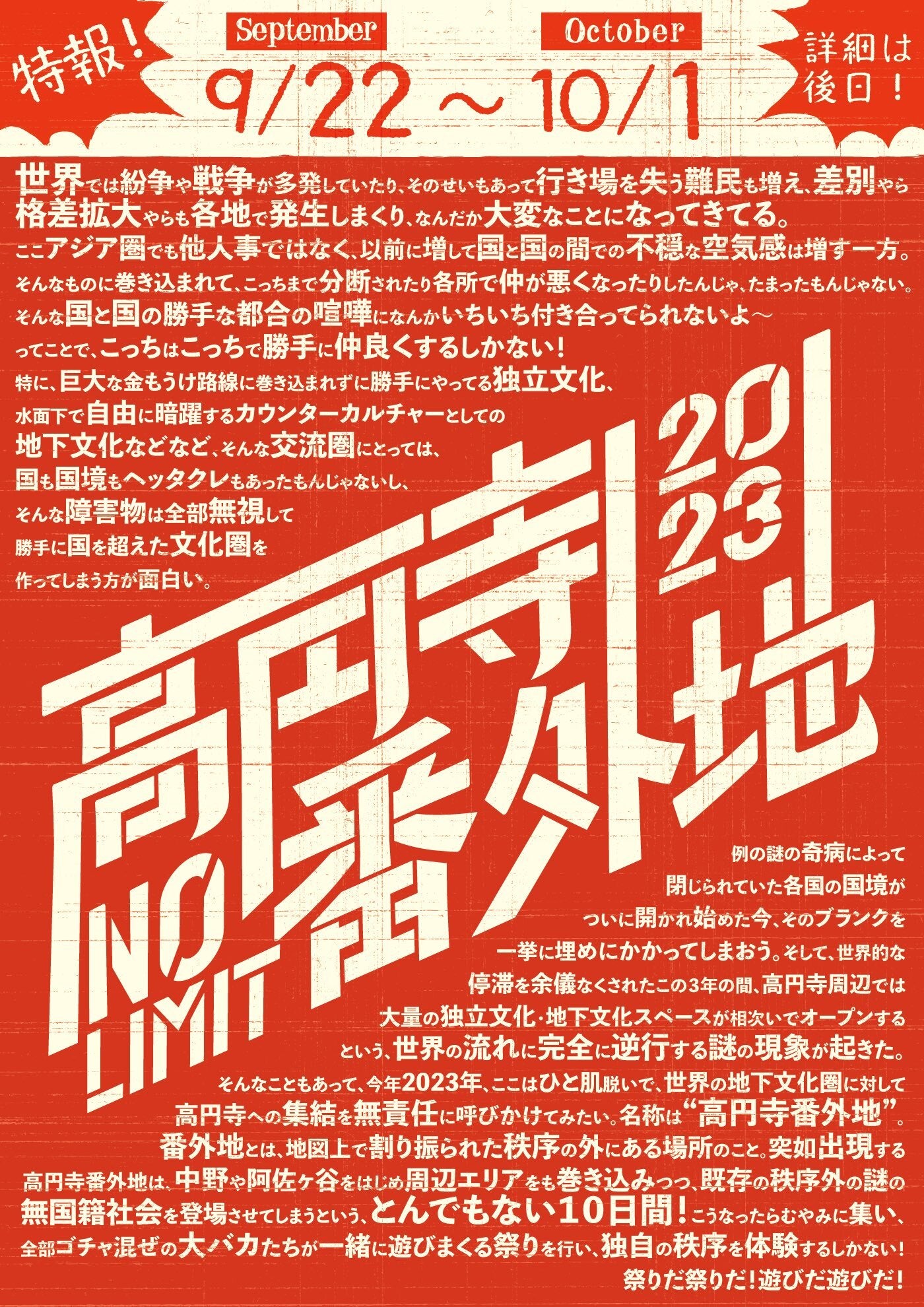 それは9月22日から10月1日まで、アジアをはじめとする各国から大勢が集まり、高円寺で交流しまくった「NO LIMIT 2023 高円寺番外地」。国同士が対立を煽っても、民間人同士で仲良くなりまくってたら争いは止められるのでは、という壮大なテーマを掲げた「祭り」で、10日間で50ほどのイベントが開催されたのだ。