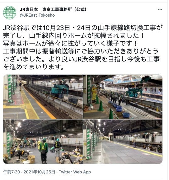 JR山手線の運休情報が記されたポスター関連記事>>渋谷駅ホームのビフォーアフター写真に「現代のプロジェクトX」と賞賛の声。山手線外回りと内回りが1本化