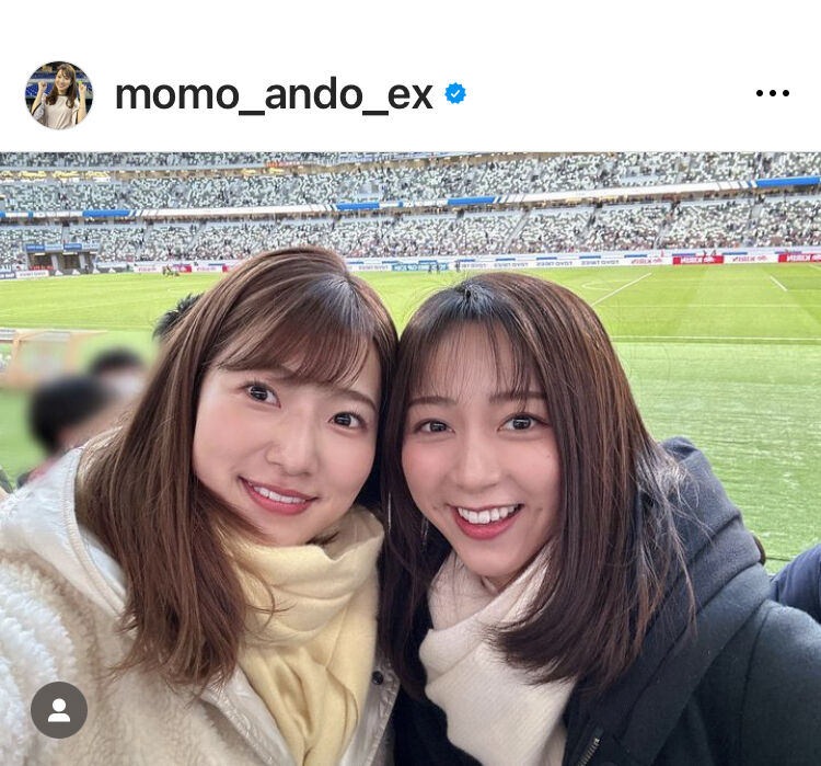 テレビ朝日の安藤萌々アナウンサー(26)が30日までにインスタグラムを更新。フジテレビアナウンサー佐久間みなみ(26)とのサッカー観戦を報告した。