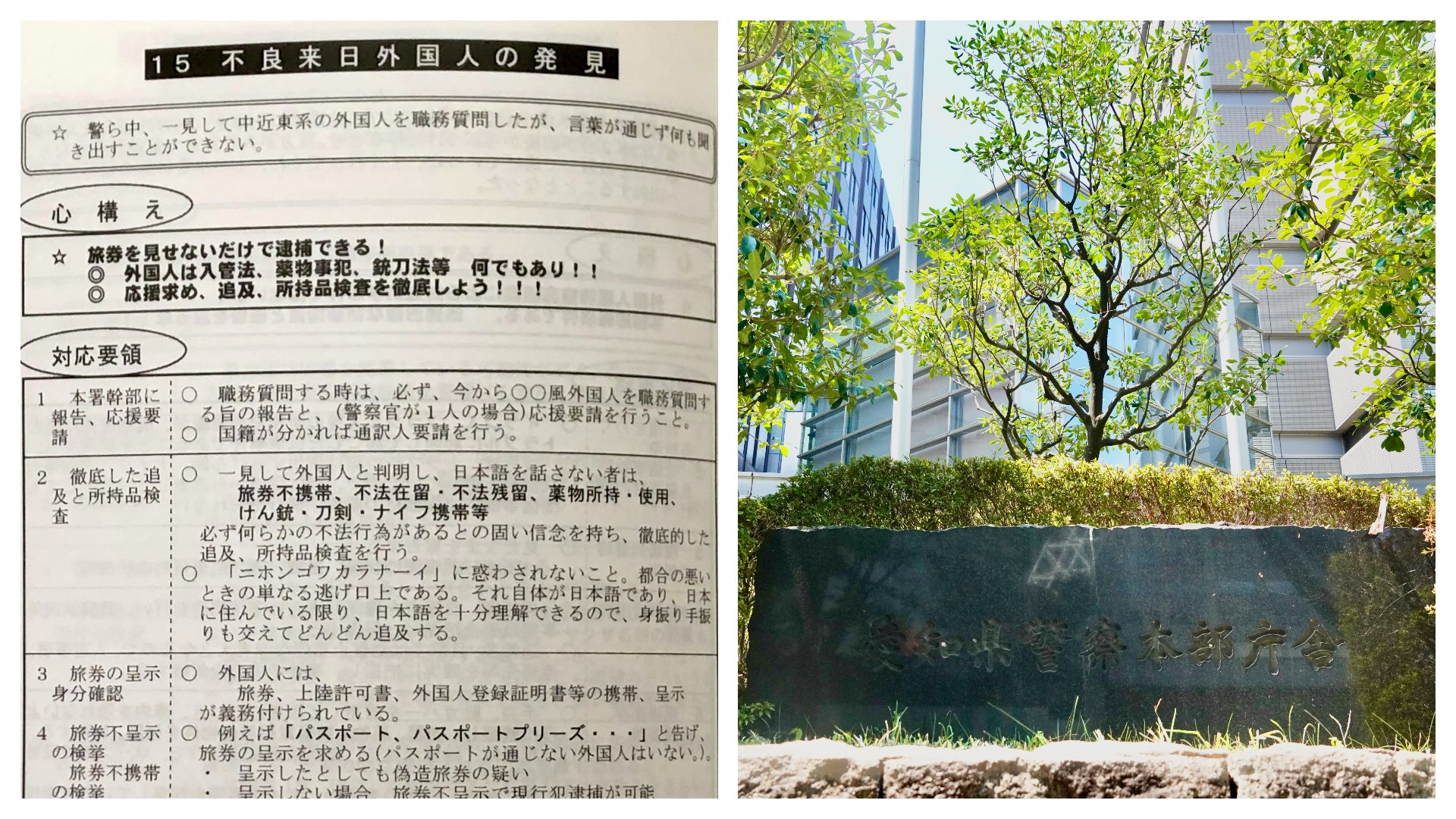 「一見して外国人と判明し、日本語を話さない者は、旅券不携帯、不法在留・不法残留、薬物所持・使用、けん銃・刀剣・ナイフ携帯等 必ず何らかの不法行為があるとの固い信念を持ち、徹底的した(※)追及、所持品検査を行う」(※原文ママ。「徹底した」の誤り)