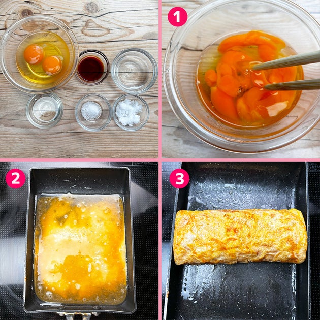 ② 卵焼き器にサラダ油を引いて中火で熱し、①の1/3量を流し入れる。