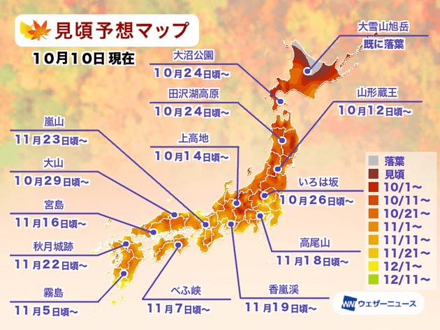 ただ、今年は9月までの昼間の暑さや日照時間が平年よりも長かった影響で、東日本や西日本を中心に一部で葉が変色しているところがあります。鮮やかな紅葉となる前に葉が枯れてしまい見頃期間が短くなる可能性があるため、紅葉狩りに行く際は最新情報をご確認ください。