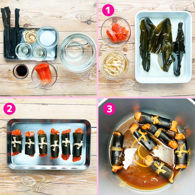 ① 早煮昆布はさっと洗い、水につけて戻しておく。戻し水は取っておく。サーモンは棒状に切っておく。かんぴょうは水(分量外、適量)で戻しておく。