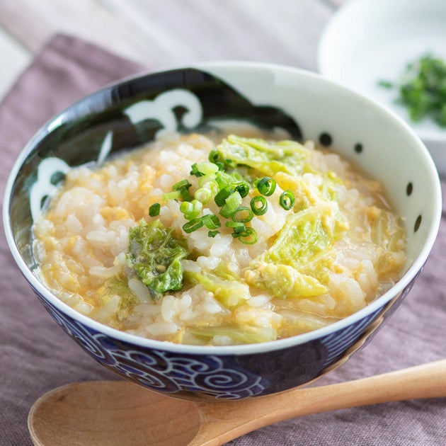 ② 鍋に【A】を入れ中火にかけて沸騰させる。①を加えて弱火にし、白菜が柔らかくなるまで煮たらご飯を加える。