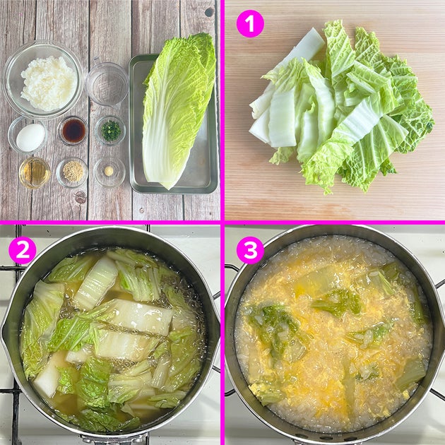 白菜と卵で作る中華風の味付けで仕上げた、シンプルでおいしい体の温まるおじやです。朝や昼にサッと作って食べてもいいし、土鍋などで作って夜ご飯にしても良さそう。ぜひ、試してみて!