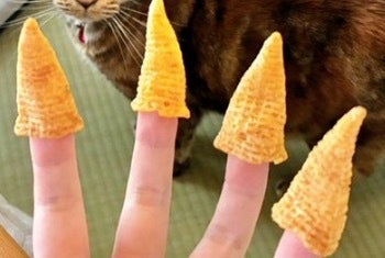 【あわせて読みたい】とんがりコーン指はめを自慢⇨「人間は愚か」みたいな目で飼い主を見つめる猫に大反響