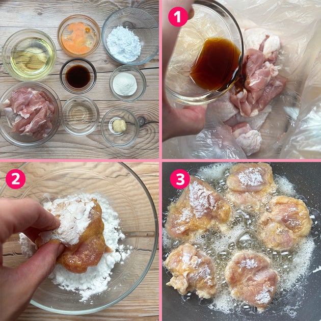 ② ①に【B】を加えてもみ込み、片栗粉をまぶす。