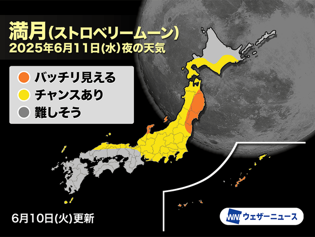 西日本の太平洋側は、梅雨空が続くため、満月を見るのは難しそうです。