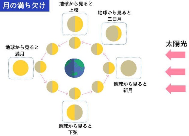 そして、太陽の光が当たっている月面の半球が地球から見てどちらを向いているかによって、三日月や上弦、満月、下弦など、見かけ上の形が変わります。