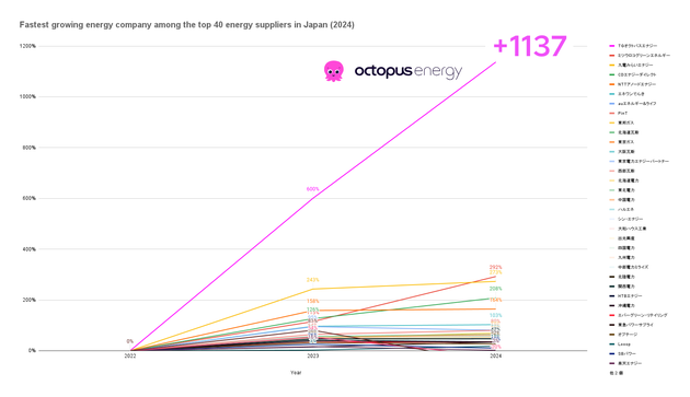 資源エネルギー庁の調査統計に基づく分析では、2024年の低圧電灯における電力需要実績において、同社は2022年から1137%の成長を記録し、電力会社上位40社の中で成長率第1位を記録したという。