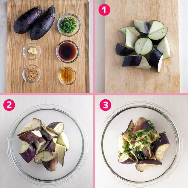 ① なすはヘタを取り、縦半分に切ってからさらに斜めに3〜4等分する。水にさらしてあくを抜き、キッチンペーパーで水気をふき取る。