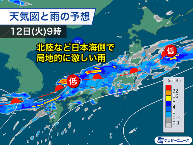 前線の北上に伴って雨の中心は山陰や北陸など本州に日本海側へと移ります。前線上の低気圧が通過するタイミングで雨が強まり、局地的には1時間に50mm以上の非常に激しい雨の降る所がある見込みです。