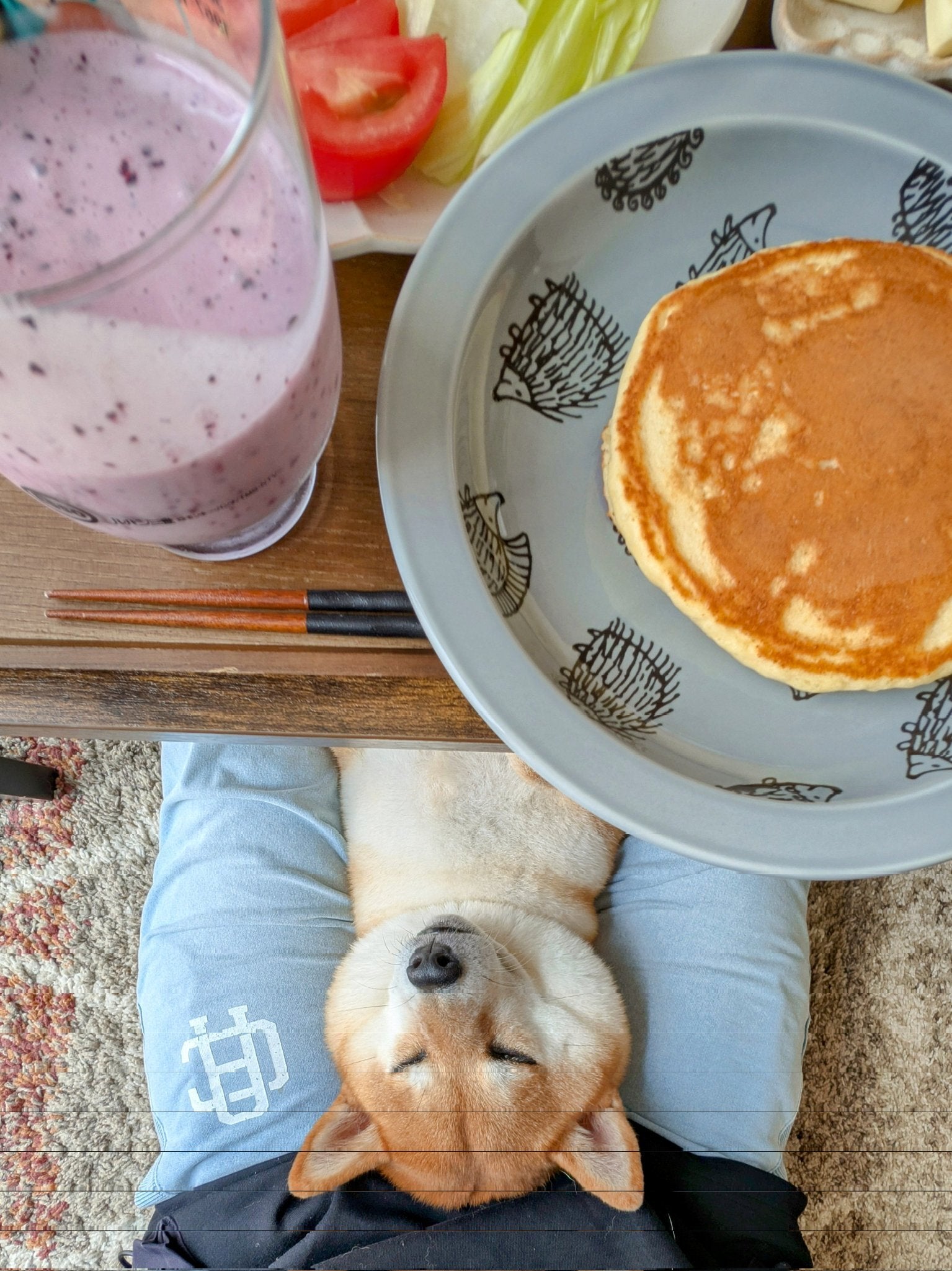 朝食はパンケーキ、野菜、ベリーのスムージー、そしてすやすやと眠る柴犬。