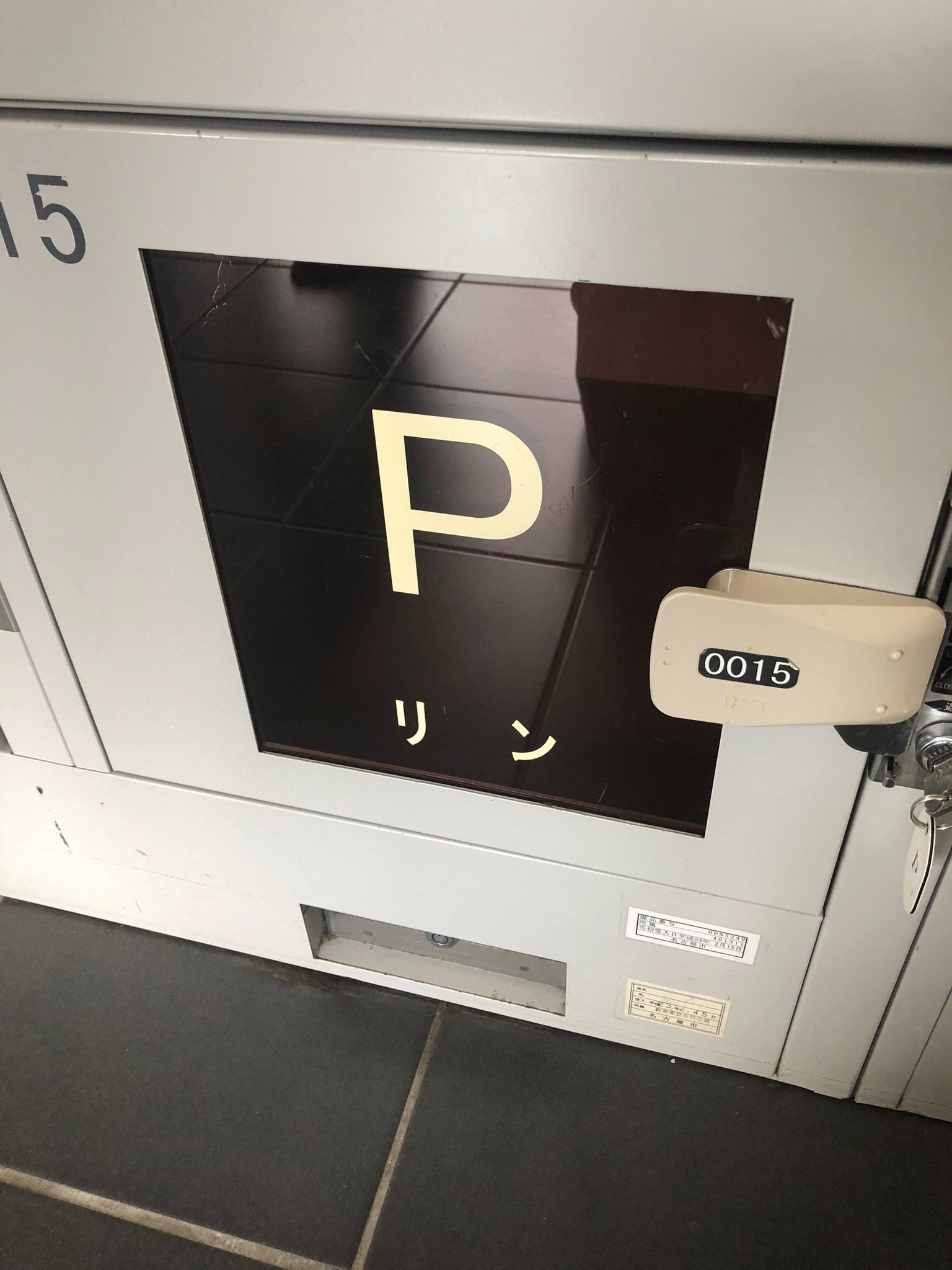 「元素記号コインロッカー」と題して、元素記号が一つずつ書かれたコインロッカーと、「P リン」と元素記号・元素名が書かれたコインロッカーの計2枚の画像をアップ。