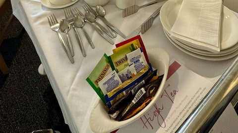 写真には、ティーポットとティーカップ、ケーキスタンドなど、本格的なアフタヌーンティーセットが用意されている様子が写っています。