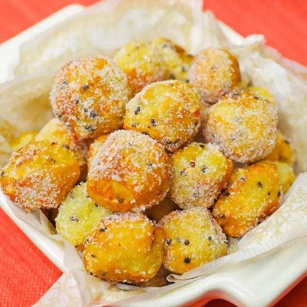 白玉粉入りのモチモチさつまいもドーナツレシピ。一口サイズなので片手でパクパク食べられますよ。おやつにピッタリ!さつまいもの消費にも◎