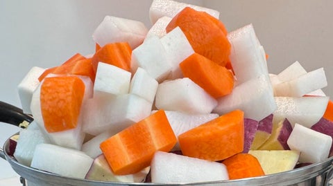 椿さんによると、この野菜スープでは、大根1本、人参3本、さつまいも2本、カットした白菜5袋、もやし1袋を使用。家族がたくさん野菜を摂れるよう、3~5日に1回のペースで作っているそうで、「結構頻繁に色んな種類の野菜スープを作っています」とのこと。