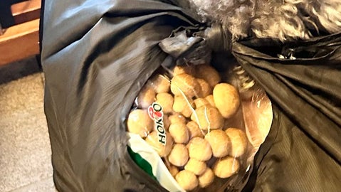 買い物から帰宅し玄関に荷物を置いた瞬間、エマちゃんはショッピングバッグに勢いよく頭を突っ込み、しきりに匂いをチェックし始めたといいます。袋の中には、しめじと、その下に隠れるように入っていた鶏ひき肉。エマちゃんは迷うことなく鶏肉の存在だけを察知したのだそうです。