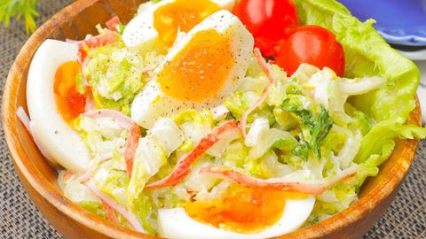 2.白菜は縦半分に切って1.5cm幅に切り、耐熱容器に入れてラップをかけ、600Wの電子レンジで3分加熱する。