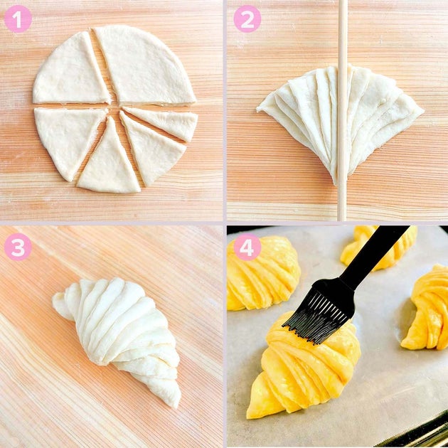 ④ クッキングシートに③をのせて溶き卵を塗り、180℃に予熱したオーブンで20分焼く。お好みで粉砂糖をかけたら、完成!