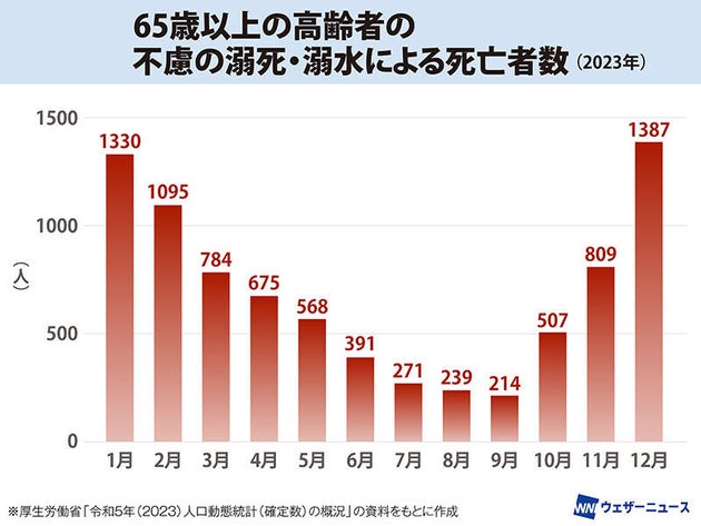 月別では12月が1387人と最も多く、1月が1330人、2月が1095人と、冬場に溺死・溺水による死亡事故が集中していることがわかります。この数字には転倒などが原因のも含まれていると思いますが、冬場に多く発生していることから、寒い時期はヒートショックによる件数が多く含まれていると考えられます。