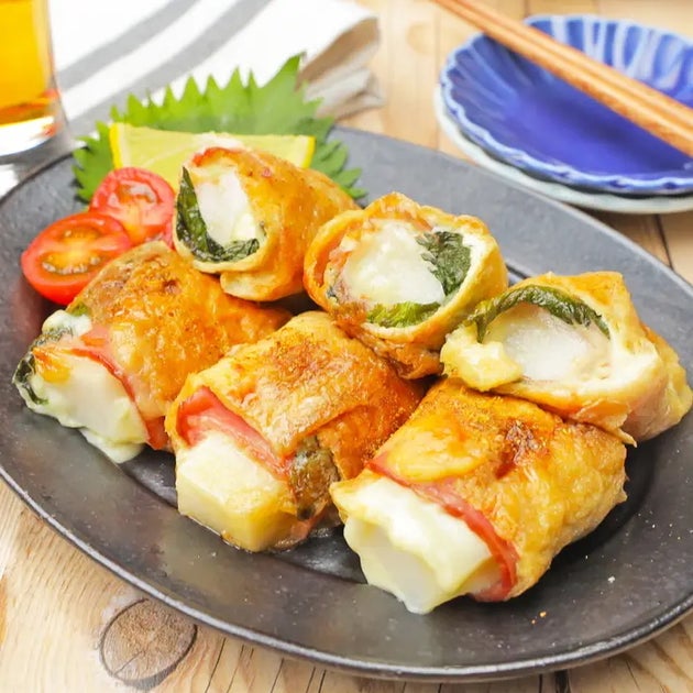 ・油揚げにお餅やベーコン、大葉をくるっと巻いて焼くだけ!外はカリッ、中はとろ〜り溶け出すチーズとお餅の食感が重なって、一口で幸せになれる絶品おかずです。