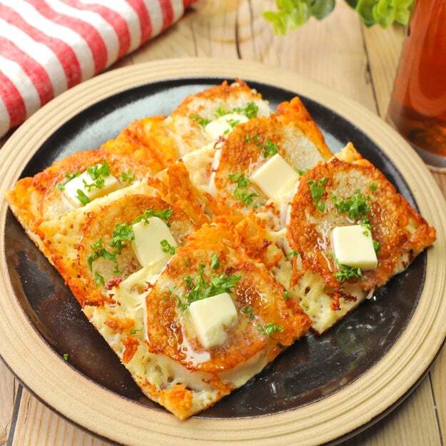中火で焼き、途中でふたをして蒸し焼きにすることで、底は香ばしく、表面はふんわりとした食感に仕上がるのが特徴。洗い物が少なく、調理工程もシンプルなので、忙しい日や疲れている日でも作りやすい一品です。刻みのりや小ねぎを添えると、風味と彩りが加わります。