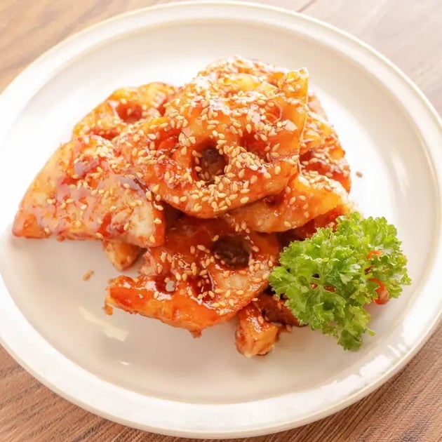 カリッと揚げたれんこんに、甘辛だれを絡めた「れんこんの甘辛唐揚げ」は、一口食べると止まらなくなる味です。