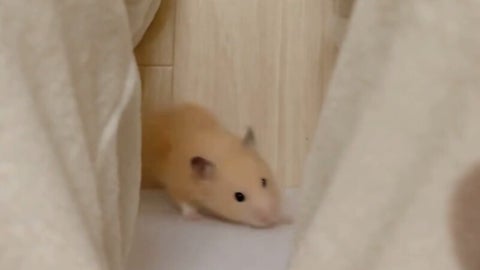 動画には、ソファに座っている飼い主の足の間から、ハムスターのころもちゃんが立ち上がって左右を行ったり来たりしている様子が映っています。