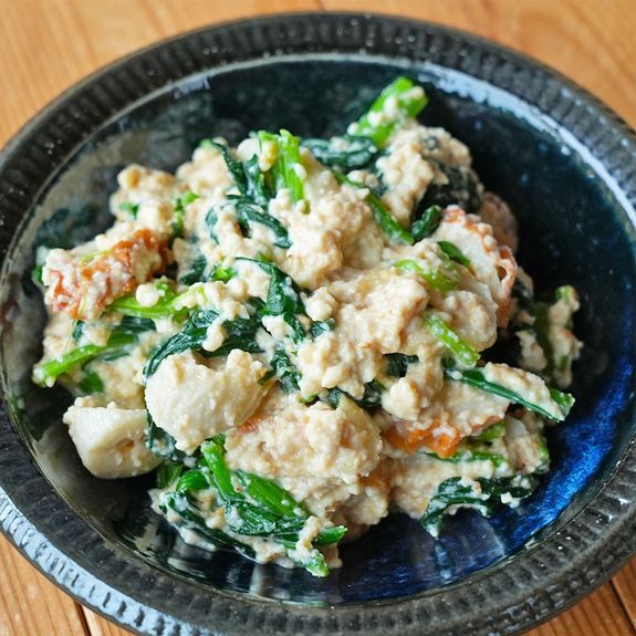小松菜と絹豆腐があったら白和えがおすすめ!マヨネーズを入れることで、コクが出ておいしく仕上がります。