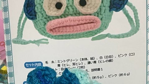 写真には、サンリオキャラクター・ハンギョドンのフェイス型巾着の編み物キットの完成見本と、りゃさんが実際に編み上げた作品が並んで写っています。完成見本と比べると、出来上がった巾着は目の大きさや位置が少しずれていたり、口元が大胆に広がっていたりと、どこか個性的な仕上がりです。