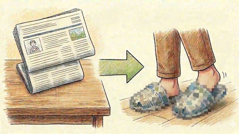 使うのは新聞紙。自分の足に合わせて折ることで、「スリッパ」に変身します。
