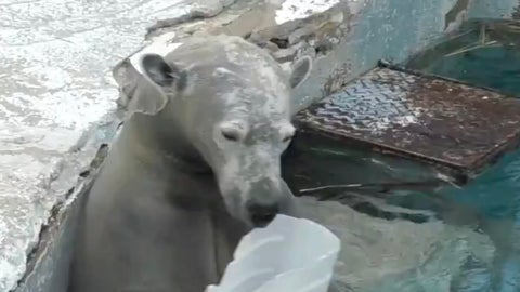 「【雑巾がけ】ホウちゃん🐻❄️🐾家事はじめました」と題し動画をアップ。大阪府大阪市の天王寺動物園にいるホッキョクグマの“ホウ”ちゃんが、水面から顔を出し、壁を雑巾がけしているような姿が写っています。