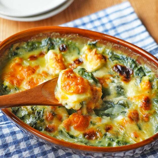 ほうれん草と卵があったら、とりあえず炒める。もちろん、それだけでもおいしいですが、ゆで卵にしたグラタンが絶品です!