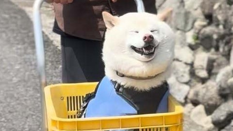 のどかな田舎道を台車に乗って運ばれる白柴の動画がSNSで話題になっています。