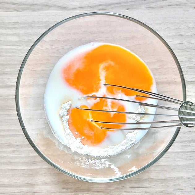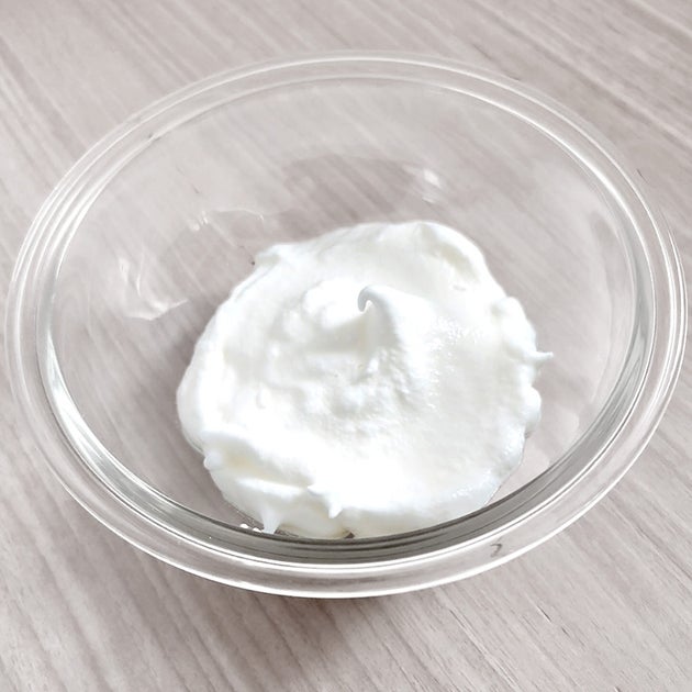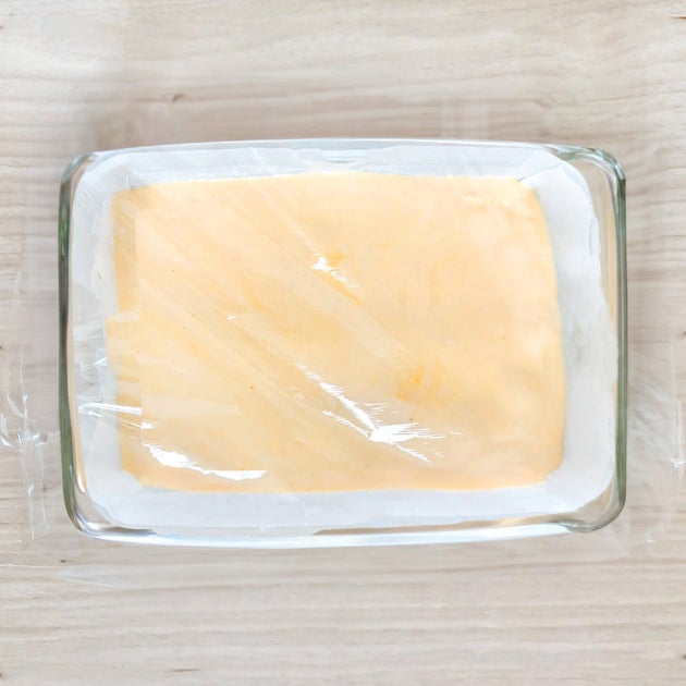 ③ 耐熱容器にクッキングシートを敷き、②を流し入れる。600Wの電子レンジで2分半程加熱して粗熱をとる。