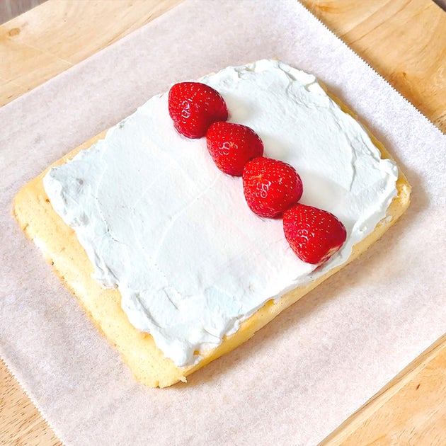 ④ ③の生地の端を1cm斜めに切り落とし、ホイップクリームを塗る。いちごをのせて巻く。