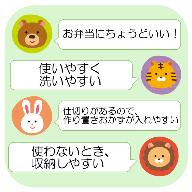 公式サイトのレビューには、「お弁当にちょうどいい!」「使いやすく洗いやすい」「仕切りがあるので、作り置きおかずが入れやすい」「使わないとき、収納しやすい」など、使い勝手のよさについて書かれていました。