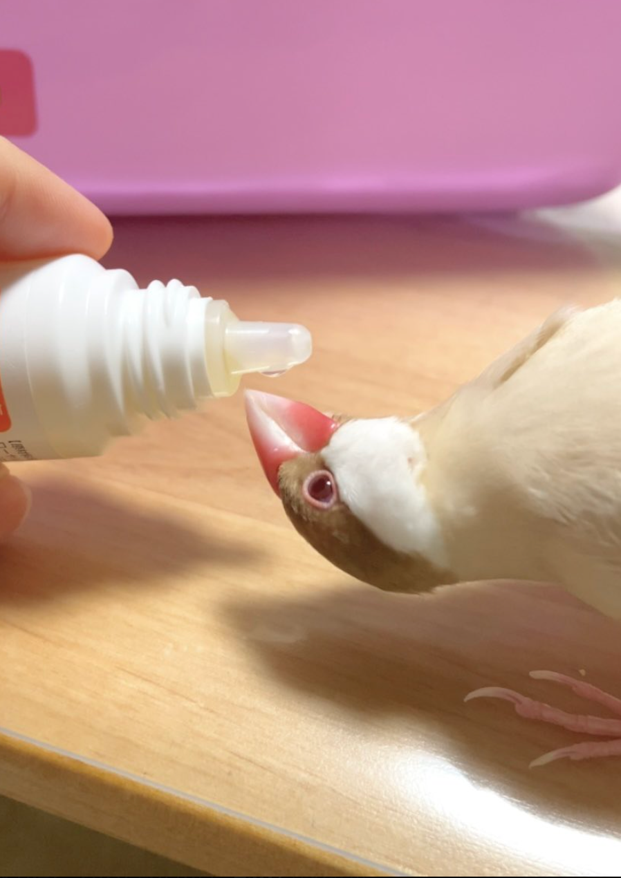 投稿主によると、栄養飲料は普段は必要ないそうですが、換羽中や疲れていそうなときに数滴与えているのだとか。ローヤルゼリーやビタミン、果糖ブドウ糖などが入っており、飼っている文鳥たちは喜んで飲むそうです。