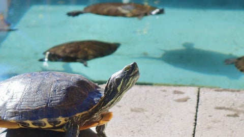 登場するのは、道の駅ウミガメ公園で暮らす、ミシシッピアカミミガメ。普段は水中で生活していますが、天気の良い日は積極的に陸に上がり、体を温めるために日光浴をする習性があるといいます。